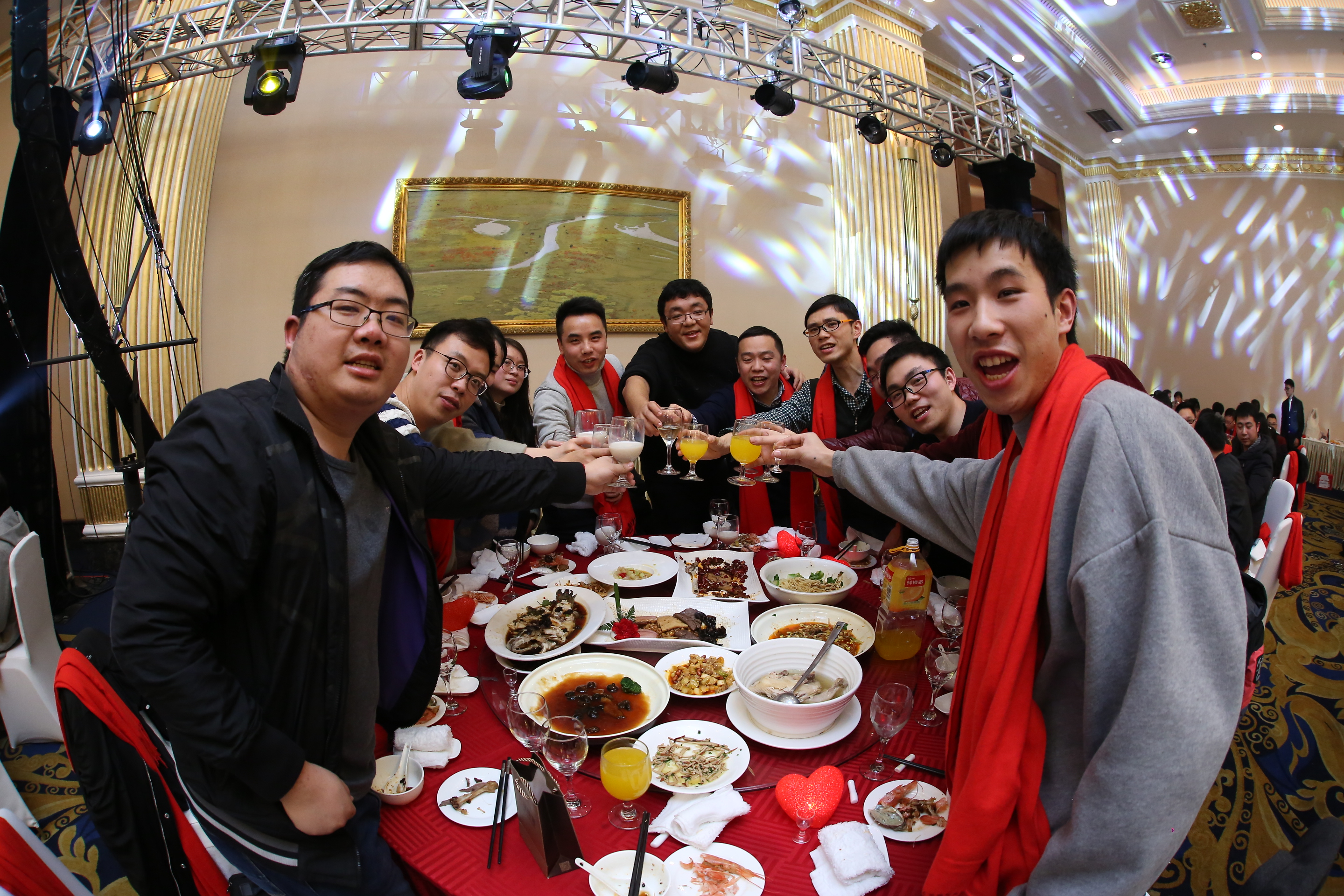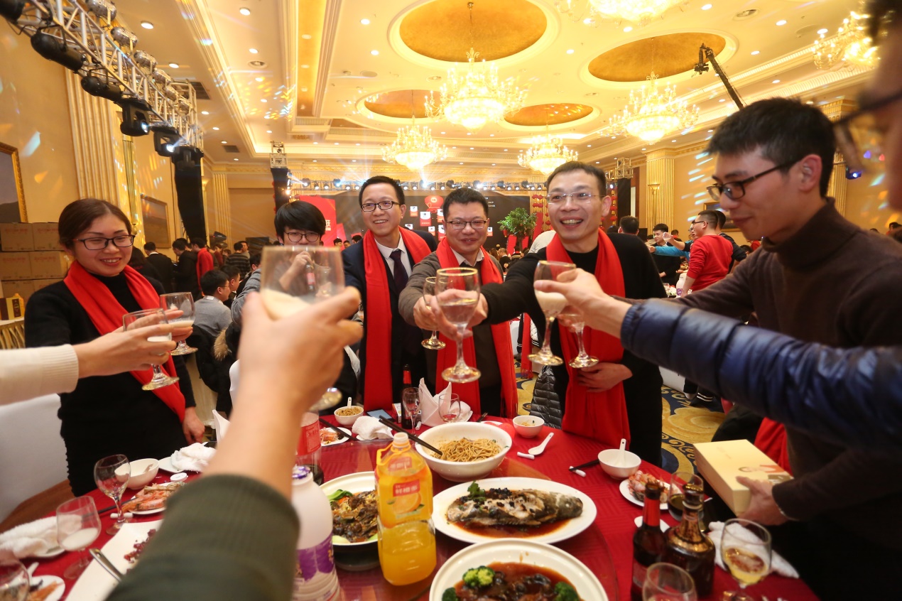 在三位副總共同舉杯致祝酒詞后,晚宴正式開(kāi)始。珍饈美酒,接踵而至,領(lǐng)導(dǎo)與員工們觥籌交錯(cuò),酣暢淋漓。沒(méi)有往日嚴(yán)肅的工作氣氛,而是像朋友家人一樣把酒言歡,臉上洋溢著喜悅的笑容,這一刻我們都無(wú)比幸福。在其樂(lè)融融的氛圍下,2018年年會(huì)圓滿落下了帷幕。